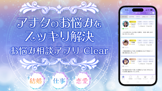 Clear(クリア)は、匿名・24時間・チャットまたは音声通話で恋愛や人間関係の悩みを相談できるチャット占い・カウンセリングアプリだ。「身近な人には言えない悩みを、安心できる環境で吐き出したい」という目的には合っている設計になっている。